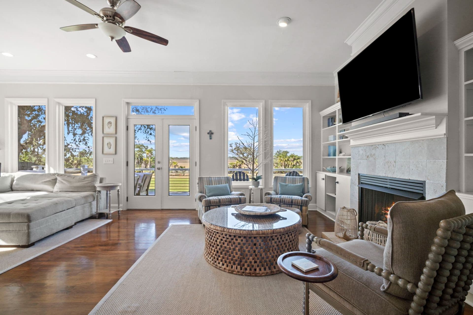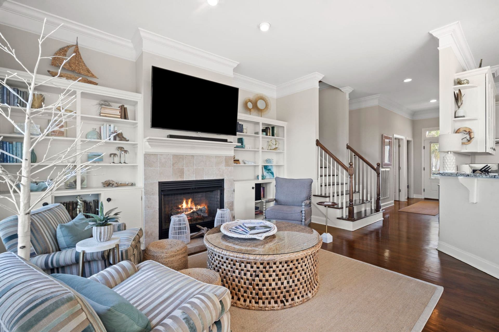 Upon entering, you’ll immediately notice the home’s open, welcoming layout and polished coastal style. Updated furnishings, curated artwork, and abundant natural light create a relaxed yet refined atmosphere throughout. The spacious living area is designed for gathering, featuring comfortable seating, a gas fireplace, and a large smart TV, while a wall of windows seamlessly connects the indoors to the outdoors. The fully equipped kitchen is ideal for everything from quick breakfasts to family dinners, with stainless steel appliances, generous prep space, a breakfast bar, and a separate wine refrigerator. Just beyond, the dining area comfortably seats eight for shared meals and memorable evenings.