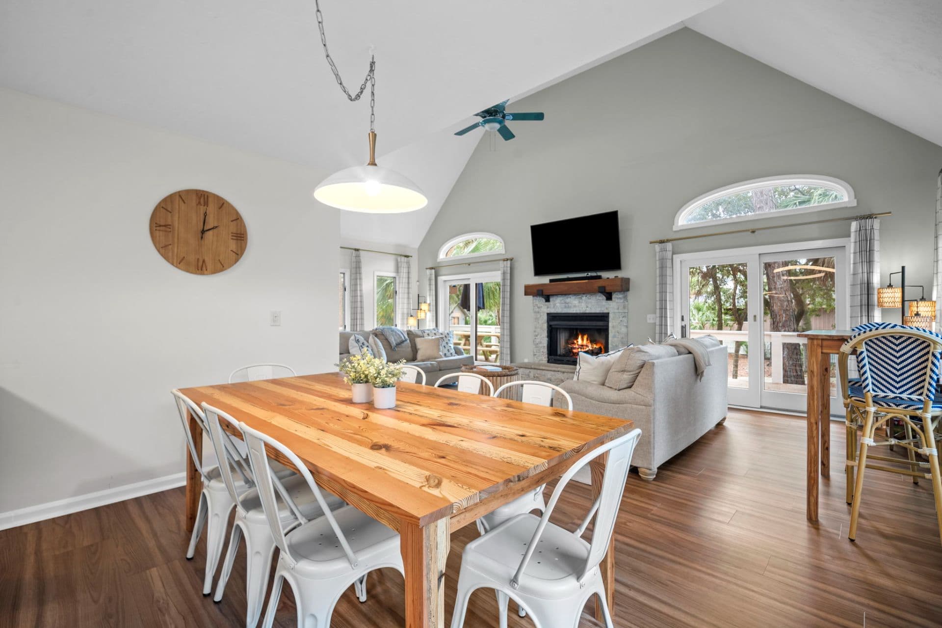 Outdoor Living & Entertainment: Embrace the island lifestyle on the inviting wrap-around porch, perfect for morning coffee or evening cocktails. Enjoy outdoor cooking with the provided gas grill and Blackstone griddle, and gather around the fire pit on cooler evenings for cozy conversation. The spacious garage has been transformed into a fun-filled recreation area, featuring: